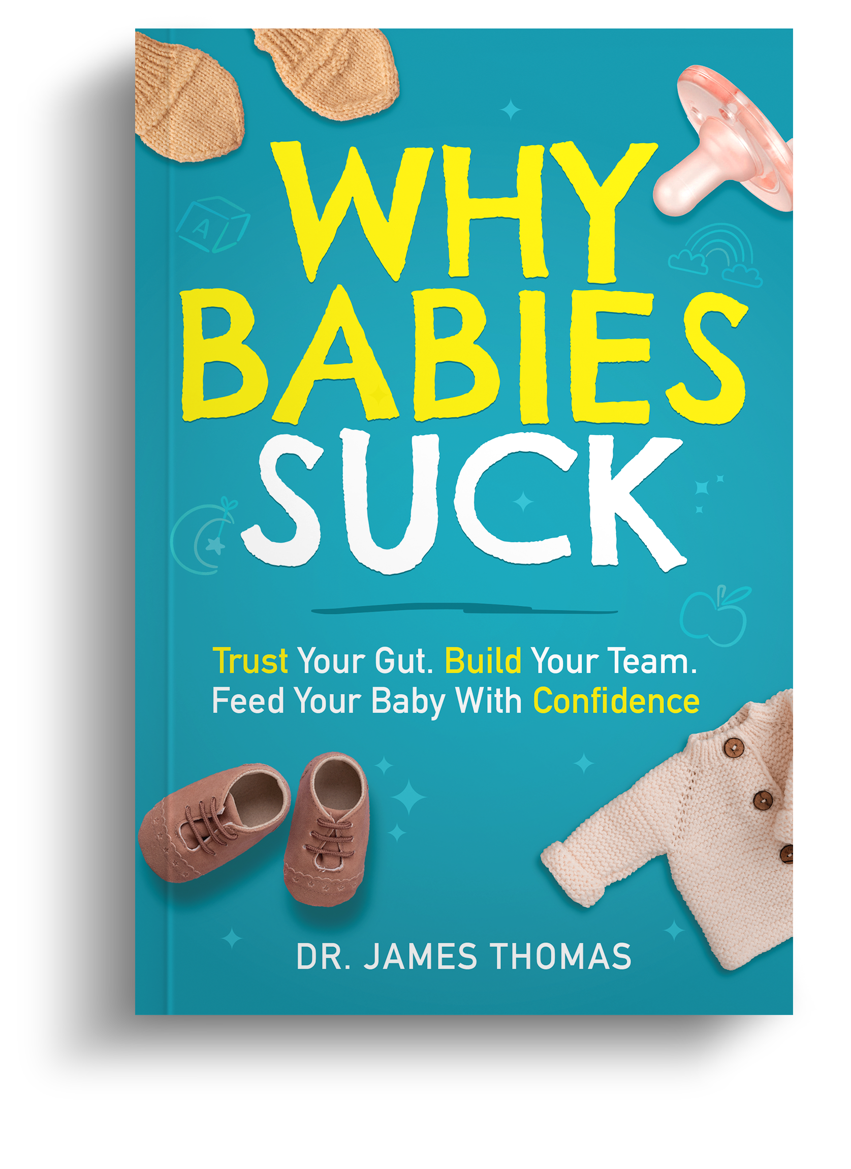 Cover of a book titled "Why Babies Suck" by Dr. James Thomas, with a blue background, yellow and white text, and images of baby shoes, knitted baby clothes, and a pacifier.