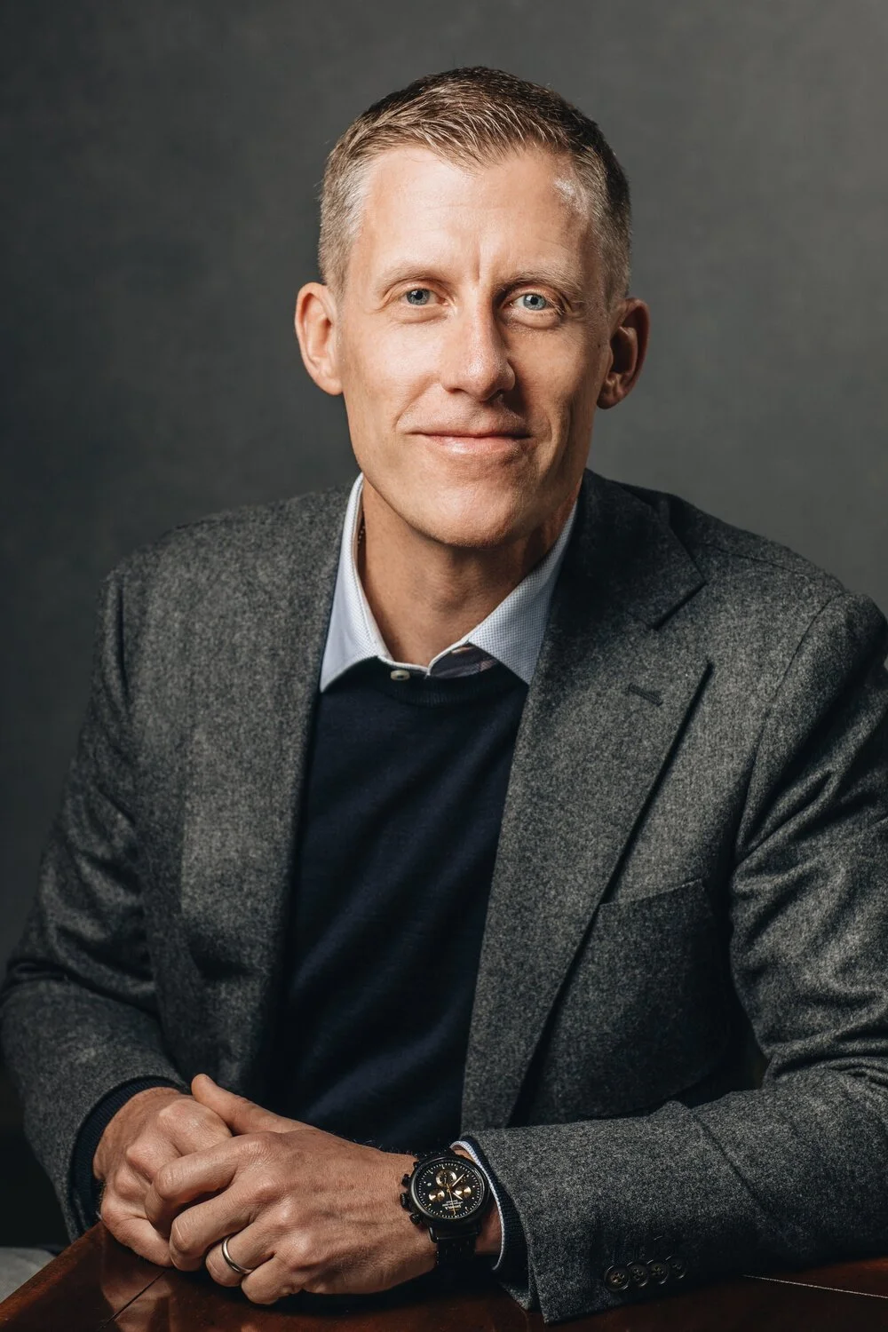 Portrait of Dr. James Thomas, wearing a gray blazer, a light blue shirt, and a black watch, smiling slightly against a dark gray background.